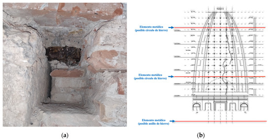 Zacarés [20] mentioned the existence of stone blocks in the dome where iron rings were fitted during the construction of the Escuelas Pías dome, specifying a weight of 613 @ (arroba), approximately 7790 kg. After two campaigns with ground-penetrating radar (GPR) technology, the existence of some metal rings was confirmed [29], similarly to what Guastavino [16] described as a “brick dome with iron rings”, understanding that the depicted figure represents the dome of the Escuelas Pías de Valencia.