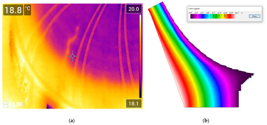 Thermal behavior: (a) image from the thermal camera, where the crack shows a thermal bridge; (b) parameterization of thermal behavior in the Therm 8 software, with an external temperature of 0 °C and an internal temperature of 20 °C.
