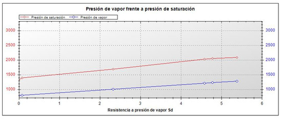 Thanks to its construction arrangement, including a 2 cm thick inner layer of plaster, a 45 cm thick solid brick dome, a layer of lime mortar, and glazed ceramic tiles, a more than satisfactory result was obtained. This is because the saturation pressure is much higher than the vapor pressure, and no condensation occurs or accumulates. The graph shows two parallel lines (Figure 12), indicating the absence of condensation accumulation.