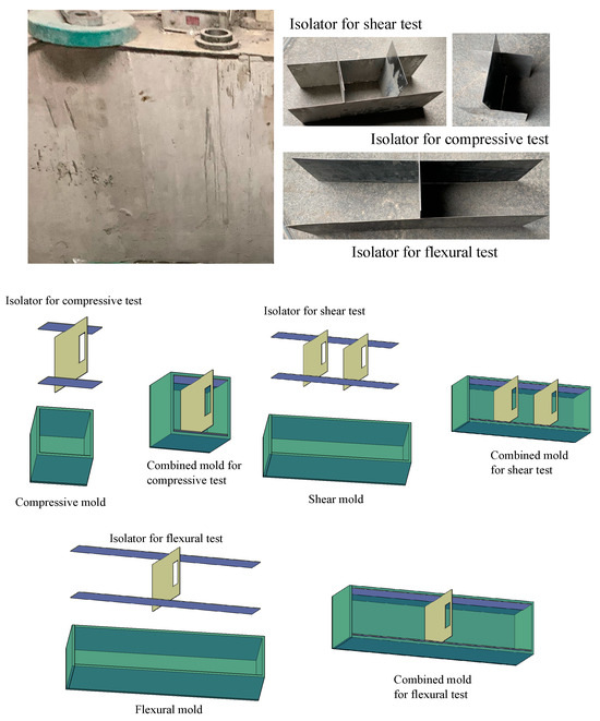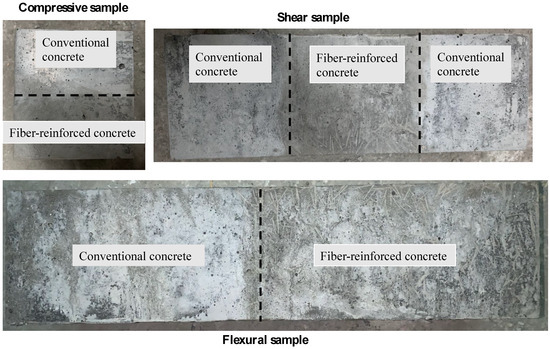 An innovative aspect of this study involved the use of stainless-steel isolators within the molds, which could be tightly embedded and divide the mold in half, as shown in Figure 2. This setup allowed for the simultaneous mixing and pouring of two different types of concrete. The concrete was filled slightly above the height of the mold to ensure that when the isolator was removed, the space it occupied was adequately filled, allowing for complete and seamless contact between the two types of concrete. The extraction of the isolator and the vibration process were synchronized to maximize the contact area between the different concrete types, which is critical for the integrity of the interface. The final molded specimens are depicted in Figure 3. The synchronized casting mold allows for the simultaneous pouring of fiber-reinforced and conventional concrete. This technique enables the testing of the flexural, compressive, and shear performance at the interfaces of different samples, providing highly relevant results for real-world high-performance localized reinforcement.