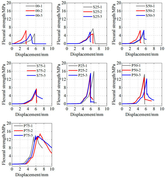 In the non-fiber-reinforced concrete specimens, the observed failure was characteristically brittle. Upon reaching the peak load, the specimens exhibited a failure mode that resulted in a clean bifurcation across the middle section. This type of brittle fracture, common in conventional concrete, lacked post-peak load-carrying capacity, indicative of minimal energy absorption prior to failure. The steel fiber-reinforced concrete showed a departure from this brittle failure mode. The initiation of cracks at the specimen’s mid-lower region, and their subsequent upward progression, highlighted the role of steel fibers. These fibers, acting as bridges across emerging cracks, redirected crack paths towards the conventional concrete. The bridging effect of steel fibers prevented the sudden failure seen in non-fiber-reinforced specimens, introducing a degree of ductility and resistance against the propagation of cracks. In the PE fiber-reinforced concrete specimens, the crack initiation was observed to be biased towards the side with PE fibers. As the load increased, cracks continued to develop within the PE fiber side, up until the point of failure. Interestingly, the increase in PE fiber volume from 0.25% to 0.75% resulted in a notable increase in ductility. This was evidenced by the pronounced post-peak region in the load–displacement curve, indicating the material’s ability to undergo significant deformations before failure.