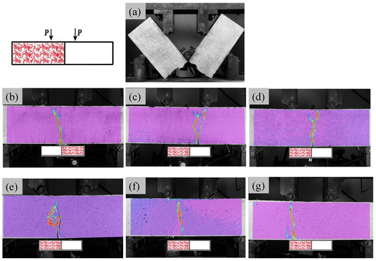 Flexural cracking: (a) 00, (b) S25, (c) S50, (d) S75, (e) P25, (f) P50, and (g) P75.