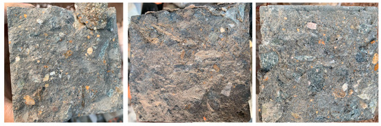 For the polyethylene (PE) fiber conditions (P25, P50, and P75), the fibers’ lightweight and flexible nature offered different advantages. The P25 samples exhibited a uniform fiber distribution with a minimal impact on porosity, as the PE fibers efficiently integrated into the concrete mix without disturbing the compaction process. As the volume of PE fibers increased in the P50 condition, the even distribution of fibers remained evident. There were small increases in porosity associated with air entrapment during mixing; however, the flexibility of PE fibers ensured overall workability, facilitating a consistent pore structure across the cross-section. In the P75 samples, where the PE fiber volume was the greatest, the fibers uniformly populated the concrete matrix. Their high aspect ratio and flexibility allowed them to occupy and bridge interstitial spaces, effectively decreasing porosity and enhancing the density of the cross-section. This enhancement in the material’s density was reflected in the improved mechanical properties, such as shear and flexural strength, validating the positive effect of PE fibers at this concentration.