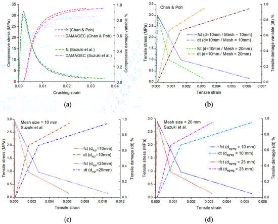In addition to plastic parameters of concrete, it is essential to specify the damage evolution in compression and tension, which can be calculated using Equations (A8) and (A9) [25].