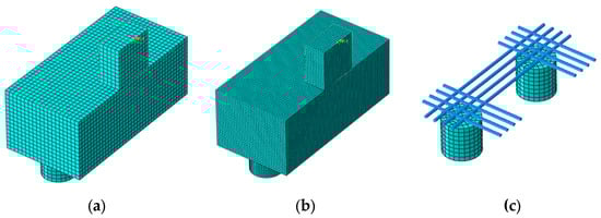 Meshed numeric models of (a) static, (b) quasi-static analysis, and (c) reinforcement bars with 10 cm2; in one direction.