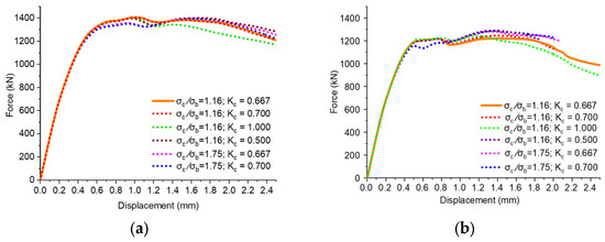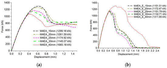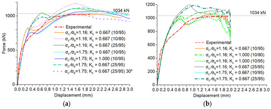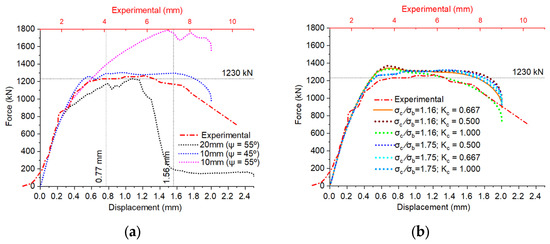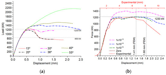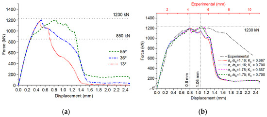 Extrapolation of with recommended values of and resulted in the curves presented in Figure 8a. It was assigned a mesh size of 20 mm, which led to a peak force closer to that in the experiment. For the model with a value of 55°, the results indicated only a substantial increase in ductility without a significant increase in peak load.