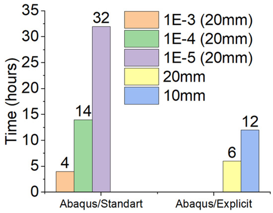 The adoption of values equal to 1 × 10−3, 1 × 10−4, and 1 × 10−5 results in similar curves. But, Figure 10 indicated that values equal to 1 × 10−5 and 1 × 10−4 presented a significant increase in simulation time than when was assumed to be 1 × 10−3.