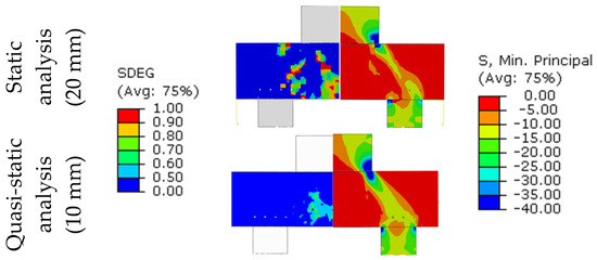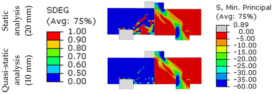 The value of μ was set to 1 × 10−4 for the static analysis, was 10 mm for concrete tensile strength, and was limited to 95%. The values of were set to 36° for the static analysis and 50° for the quasi-static analysis. These values were adopted based on their influence observed in the model calibration.
