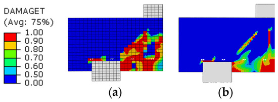 Considering the optimal mesh configuration and the parameters and set to 1.16 and 0.667, the ψ value was adjusted to 13°, 20°, 36°, 40°, 50°, and 55° in both analysis modes. Based on the best convergence curve according to the experimental one, the ψ value was defined. In the case of the “static” analysis mode, due to the influence of the μ parameter on the tensile strength and damage distribution [45,49], the behavior of the curve was evaluated for μ values of 0, 1 × 10−3, 1 × 10−4, and 1 × 10−5. From the optimal μ obtained, a sensitivity analysis of the parameters and was carried out, with values of and fixed. In all the cases, the eccentricity value () was kept equal to 0.1.