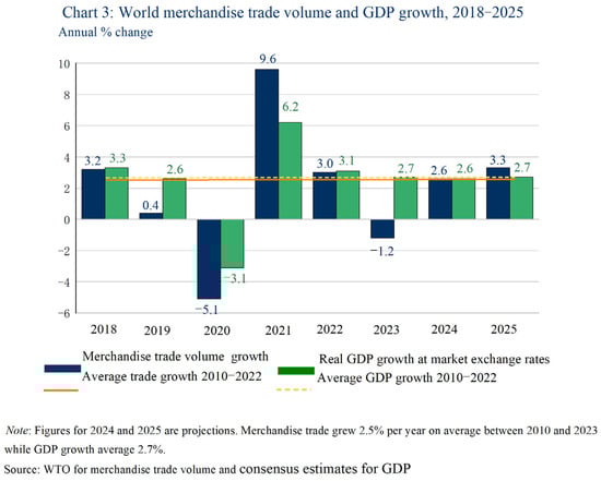 With the development of economic globalization and international trade, ocean transportation has become the most essential route to address logistics [,,]. The port, as an important hub of ocean transportation, is the distribution center of import and export cargoes; it is a place for freighters to berth, load, and unload cargoes, move passengers, and renew provisions. Since the 1980s, many ports have been built all over the world to improve logistics capability, such as the Port of Rotterdam in the Netherlands, the Port of Shanghai in China, the Port of Singapore, and the Hong Kong Port. Over the last two centuries, trade has grown remarkably. Nowadays, approximately a quarter of total global production is exported. According to WTO statistics (Figure 1), the world merchandise trade volume decreased by 1.2% in 2023 but will increase by 2.6% and 3.3% respectively in 2024 and 2025. A larger-scale modern port can more orient such an increase in demand, as it is trade-driven.