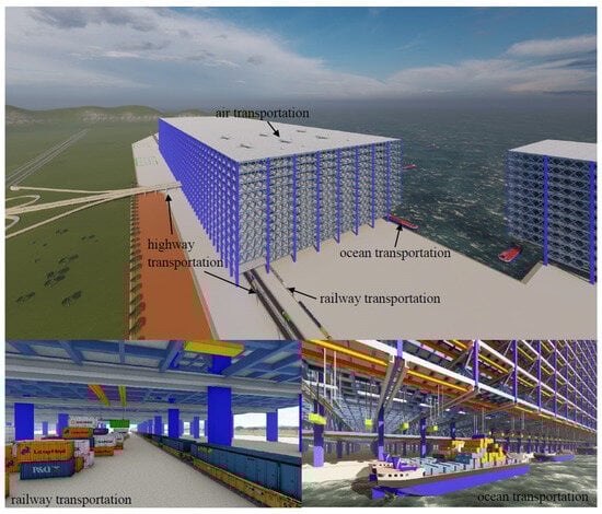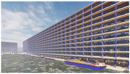 Most of the active wharves and wharves under construction are in the planar mode. Although many scholars are committed to innovating wharf structure and improving loading and unloading efficiency, breakthrough progress has not been achieved. At present, fully automated container wharves are being further researched, but most are limited to the plane mode [,]. Chang et al. [] predicted the integrated scheduling problem at automatic container wharves. Combining the characteristics of automatic container wharves to study the integrated scheduling problem was suggested in their research. The integrated scheduling problem of the wharf can be solved by algorithm computation and simulation checking [] However, loading and unloading efficiency cannot be significantly improved by optimizing the operation process. The planar dispatch scheduling of the traditional plane wharves cannot take full advantage of the space resources above the wharf. The layout of container yards, train lines, sorting centers, etc., is rigid and is prone to conflicts on the plane. It is difficult to upgrade the berth of the traditional wharf once it is completed. Also, the limited operational radius and single-line operation mode of the cranes reduce the loading and unloading efficiency. Therefore, a three-dimensional wharf is needed so that it can more reasonably satisfy the functions of the port.