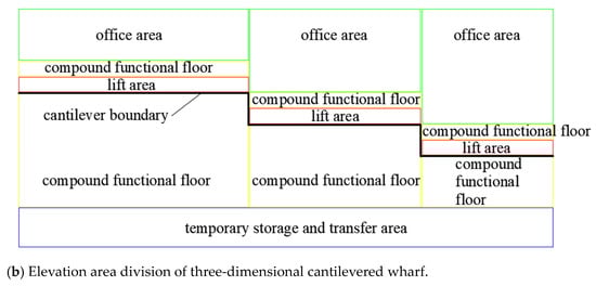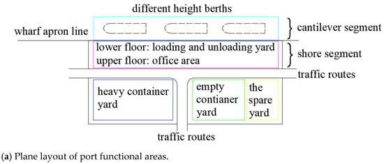 The plane and elevation area division of the port is shown in Figure 4. The plane layout is roughly planned for the following parts: heavy container yard, empty container yard, berths, office area, loading and unloading area, and traffic routes. The elevation area division is about the floor function division of a three-dimensional cantilevered wharf. It can be seen that the port has a small footprint and can realize three-dimensional space utilization.