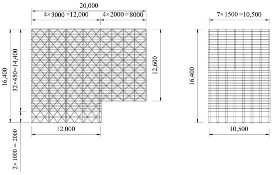 As shown in Figure 6, the cantilever height of the wharf model is 38 m. Its length is 200 m, and its width is 105 m. Its shore segment and cantilever segment include compartments of 15 m × 30 m and 15 m × 20 m. The total height of the wharf model was 164 m, the height of the bottom two floors was 10 m, and the height of the top three floors was 4.5 m, which is applicable to different functions. The bottom floor was covered with 15 cm of concrete floor above concrete beams. The superstructure components’ cross-section adopted a steel ribbed box, except for the floor slab. The substructure of the wharf adopts a 36 m deep high-pile foundation. Inclined piles are used to fix the vertical piles, and the vertical piles are designed according to the requirement of bearing capacity. Detailed parameters of the three partial models are summarized in Table 1. The material properties are listed in Table 2. Some components are inevitably subjected to high axial forces, such as seaward columns and cantilever web members, etc., thus using high-strength steel to ensure the strength demand.