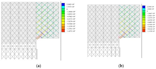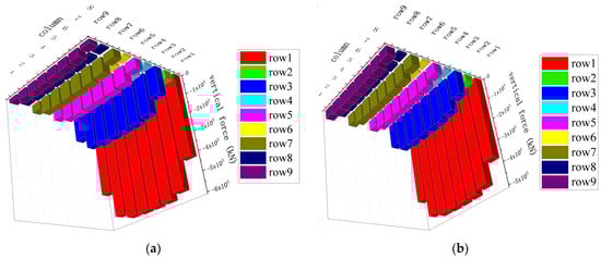 As is shown in Figure 8 and Table 3, the maximum vertical force is generated in off-ward columns, which is more than twice the others. The offward column foot’s force accounts for 51.78% of the total under load Combination I and 51.68% under Combination II. The vertical force on the top of the second-row pile accounts for 6.10% and 5.03%. The second row of columns’ foot bearing force accounts for 19.17% and 17.03%. Other pile block forces are small, accounting for 22.95% and 26.25% in total.