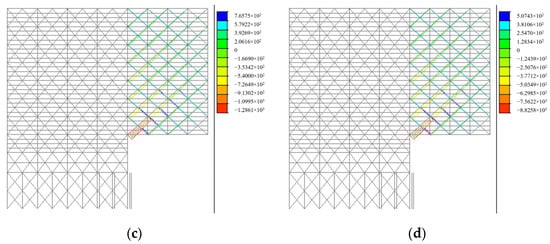 Structural internal force of cantilever segment (unit: kN): (a) axial force of web member under load combination I; (b) axial force of web member under load combination II; (c) vertical shearing force of main beam under load combination I; (b) vertical shearing force of main beam under load combination II.