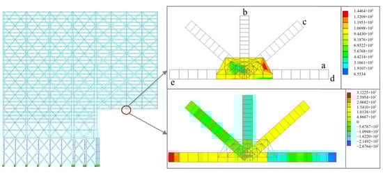 As shown in Figure 10, a joint is selected from the overall analysis model (using the (a) connection form in Figure 5). Based on the Saint-Venant principle, a truncated member is placed 2 m away from the joint, which can avoid the influence of stress concentration on the joint caused by the cross-section a to e. The joint is analyzed by applying displacement boundary conditions at sections a to e. The applied displacements are the displacements from the sections a to e in the overall analysis model. The joint analysis model is modeled by the Midas plate element, with 1207 elements.