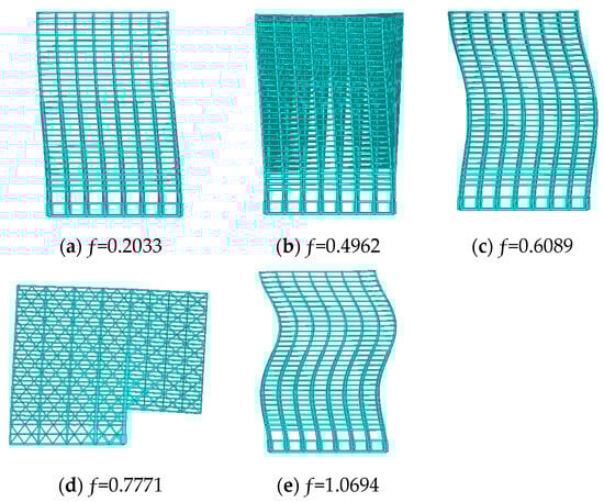 Natural vibration modes: (a–e) the first five natural vibration modes and frequencies for the structure.