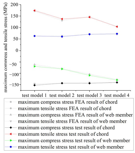 Table 8 and Table 9 list the stress results. The maximum stress results given by MIDAS and the experiments of test models I, II, III, and IV under loads of 2, 4, 6, and 8 tons are compared in Figure 15. Notice that the maximum stress of the chord occurs at the cantilever support line. With the increase of the height–cantilever ratio of the test models, the maximum stress shows a decreasing trend. Meanwhile, the maximum stress of web members increases so that the stress level of components of the truss is average.