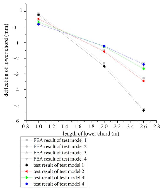 Table 10 lists the deflection results; the corresponding comparison is shown in Figure 16. The maximum deflection of test models I, II, III, and IV is, respectively, −5.31 mm, −3.35 mm, −2.71 mm, and −2.49 mm. All occur at the end of the upper chord cantilever segment. Notice that with the increase of the height–cantilever ratio of the test model, its in-plane stiffness is greatly improved.