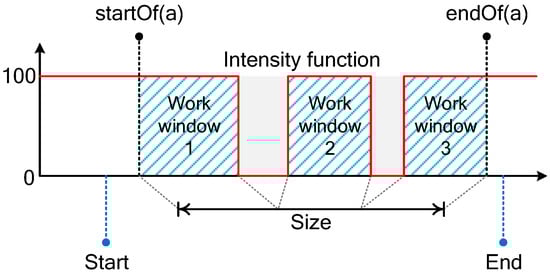 Interval variables allow for the expression of an activity’s duration, start and finish time, and potential work or rest windows in a single variable. Additionally, interval variables can be optional. If an optional interval variable is not present in the final solution, it will not be considered by any constraint or expression on interval variables it is involved in. Otherwise, its feasible domain will be reduced to a singleton defined by its actual start and finish time. The concept of optionality is utilized to model alternative modes and possible scheduled times for executing a given activity. CP is becoming more attractive in project scheduling literature due to its advantages [49,50].