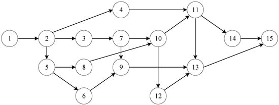Table 1 reports information on activities, including activity number, description, alternative modes, and possible work/rest patterns. As per the Measures of Beijing Municipality for Prevention and Control of Environmental Noise Pollution [53], any construction operation that causes environmental noise pollution is prohibited during nighttime and weekends in urban areas where noise-sensitive construction structures are concentrated. To ensure efficient execution, Activities 1 (services: plumbing, electrical, and heating services), 4 (gas piping), 12 (electrical fittings), 13 (kitchen fitted cupboards), and 14 (sanitary appliances) must be executed in a day pattern. Activities 3 and 6 are designated technological breaks, and Activity 15 is a dummy-end activity; therefore, they follow a dnw pattern. The remaining activities may choose different work/rest patterns as needed. If an activity is performed during nighttime hours, its direct cost should include the expense of night work. Additionally, if the activity is performed on weekends, the cost of the weekend should also be included.