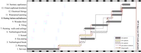 This case study considers a real project, a schedule of finishing works in a residential building. Figure 3 displays the precedence network of the project, where each pair of activities is connected by an FS precedence relation with zero lag time.