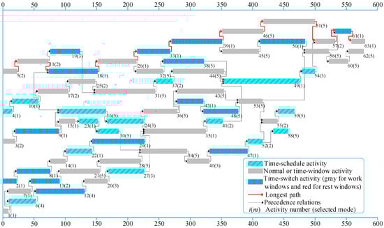 Figure 6 shows the optimal schedule for the fictitious project with a deadline of 580 days, obtained by the proposed CP model within 1 s. As in case study 1, we observed that not every activity in a time-constrained network can start as soon as all of its predecessors are finished due to the presence of time constraints. For instance, although time-schedule activity 58 has only one preceding activity 52 that can end before day 416, it cannot begin before day 433 due to the time-schedule constraint . Additionally, the length of the critical path in a time-constrained activity network is likely to exceed the total working time of all activities on the path if there are critical activities with time constraints. To be specific, the critical path of the schedule shown in Figure 6 is with a length of 580 days. However, the total working time of all critical activities on the path is only 506 days.