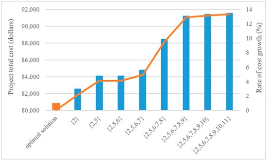 One of the key features of the proposed CP model is the classification of activities into distinct categories, including normal activities, time-window activities, time-scheduling activities, and time-switch activities. If all activities are classified as normal activities, the proposed model will essentially become the traditional DTCTP model. The real-life project in Case Study 1 is comprised of 15 time-switch activities. Three of these activities follow a dnw pattern, five must follow a day pattern, and the remaining seven (2, 5, 7, 8, 9, 10, and 11) have three alternative work/rest patterns: day pattern, d&n pattern, and dnw pattern. The dnw pattern allows for activities to be executed every day and night, including weekends. Therefore, activities with a dnw pattern can be treated as normal activities. A sensitivity analysis is now conducted, whereby the work/rest pattern of activities 2, 5, 7, 8, 9, 10, and 11 are progressively replaced with the dnw pattern, and the resulting change in the total project cost is observed. Figure 7 illustrates the results of the sensitivity analysis. As the number of activities adopting the dnw pattern increases, the total project cost shows a significant increase, reaching a maximum of 13.31%. This result suggests that the work/rest pattern of activities is an important optimization element and that there is a need to develop methods for solving the DTCTPTC similar to the proposed CP model.
