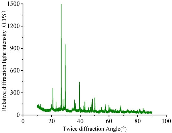 An X-ray diffractometer was used to analyze the mineral composition of the coal gangue. The test results are shown in Figure 2. The main mineral composition of coal gangue was determined as follows: quartz 41.24%, calcite 26.57%, illite 15.31%, kaolinite 11.43%, chlorite 4.11%, feldspar 1.02%, and other 0.32%.