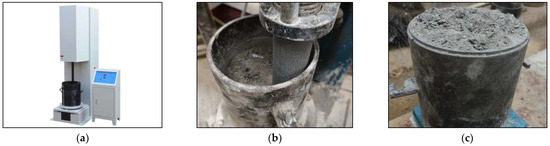 First of all, the coal gangue and each admixture were prepared according to the scheme shown in Table 1. Then, the coal gangue was fully stirred, and then, the coal gangue was sealed and placed for more than 6 h to make full contact. Then, the dry density index of the sample was obtained using the heavy compaction test (Figure 3). The heavy compactor is shown in Figure 3a, and the experimental equipment parameters are as follows: hammer mass of 4.5 kg, hammer drop height of 45 cm (Figure 3b), inner diameter and height of the sample cylinder of 15.2 cm and 17 cm, respectively, sample volume of 2177 cm3 (Figure 3c), compacted in three layers with 98 blows per layer, and maximum particle size of 40 cm. The dry density after the experiment was obtained using Equation (1):