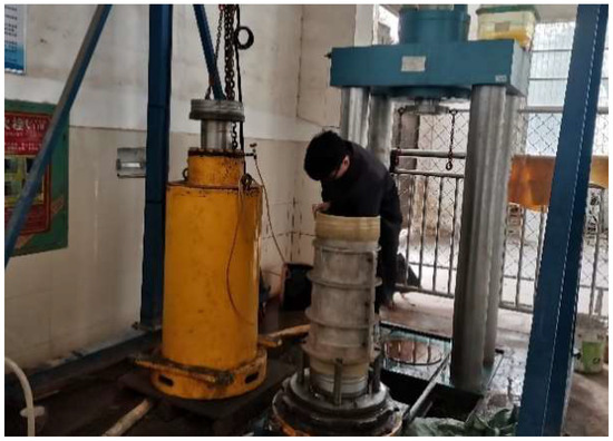 The large-scale dynamic triaxial test was conducted using a large dynamic and static triaxial test instrument, as shown in Figure 4. The experimental steps included sample preparation, saturation, consolidation, and loading. The detailed test steps are as follows: first, during sample preparation, the sample size was 300 mm × 600 mm, and the sample was prepared using the dry packing method. The coarse-grained subgrade filler was divided into five equal parts for preparation and then each particle part was mixed thoroughly and evenly. The layered vibration method was used to compact each layer of particles to a given height. After each layer of particles was compacted, the surface became rough, and then, the next layer of particles was compacted. During the manual compaction process, the particles were gently pressed with a compaction hammer, and the position of the particles was continuously adjusted through dynamic disturbance to achieve the goal of compaction, avoiding particle breakage as much as possible during the compaction process. By controlling the mass and height of each layer of particles, the goal of controlling the compaction degree of the sample was achieved. Second, during sample saturation, once sample preparation was complete, the sample in the pressure chamber was placed into the loading device. The sample was saturated using the reverse pressure saturation method, and then, the saturation of the sample was checked using the B-value. When the B-value was greater than 0.95, the sample was considered to have reached the saturation requirement. Third, during sample consolidation, the consolidation of the sample was carried out using the method of isobaric consolidation, during which the water inside the sample was discharged through a volumetric tube. Once consolidation was complete, the sample was loaded. Fourth, during sample loading, when the sample reached the given cycle numbers or the accumulated axial strain of the sample reached 15%, it was considered that the sample had been damaged.
