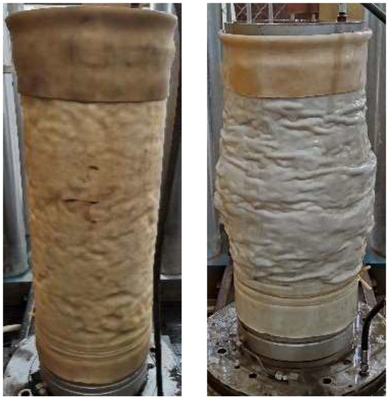 Typical samples before and after the large-scale triaxial test are shown in Figure 5. It can be seen that during the loading process, the sample is subjected to traffic load and confining pressure, and the upper and lower parts of the sample are squeezed to the middle, resulting in the failure mode of the sample mainly in the form of the middle bulge.