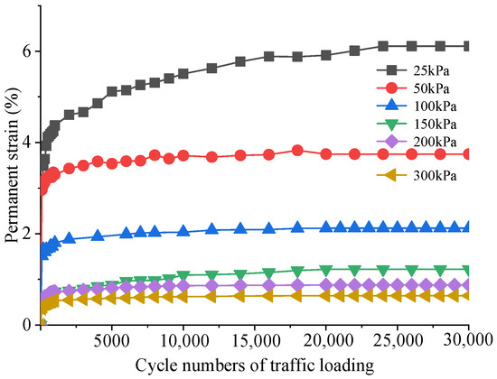As shown in Figure 6, when the confining pressure increases from 25 kPa to 300 kPa, the permanent deformation of coal gangue samples decreases by 2.37%, 1.62%, 0.90%, 0.35%, and 0.23% in turn. Therefore, the influence of confining pressure on the permanent strain of the sample is significant, and the permanent strain of the sample gradually decreases with the increase in confining pressure. When the confining pressure is low, the increase in confining pressure leads to a large reduction in the permanent deformation of the sample, but when the confining pressure is high, the increase in confining pressure leads to a small reduction in the permanent deformation of the sample.
