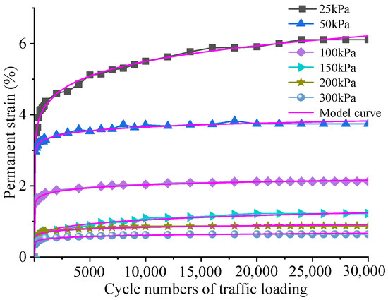 The curves of the permanent strain of coal gangue subgrade filler and the number of traffic cyclic loads under different confining pressure conditions are shown in Figure 6. It can be seen from Figure 6 that the relationship between the axial permanent strain of coal gangue and the number of vibration times of cyclic loads under traffic cyclic loads can be divided into three parts: first, the rapid increase stage. With the increase in cycle times, the curve presents an approximate linear increase. Then comes the slow growth stage, where the degree of curve growth gradually becomes slow, and with the increase in the number of cycles, curve growth gradually decreases. Finally, in the basic stability stage, the permanent strain basically tends to no longer change, and the curve changes very little.