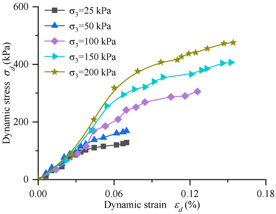 Figure 8 shows the dynamic stress–dynamic strain relationship curve of the coal gangue subgrade filler under traffic load. It can be seen from the figure that the dynamic stress of the sample increases with the increase in dynamic strain. The greater the confining pressure, the greater the dynamic stress when the specimen is destroyed.