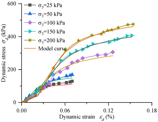 In order to further analyze the dynamic constitutive relationship of coal gangue samples under traffic load, the Hardin–Drnevich model was introduced to analyze the dynamic constitutive relationship of coal gangue subgrade filler, and its expression is as follows: