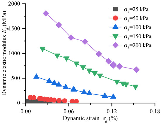 The dynamic modulus of the sample was calculated using Equation (9). Figure 10 shows the variation law of the dynamic modulus of coal gangue samples under dynamic traffic load. It can be concluded from the figure that the dynamic modulus decreases with the increase in dynamic strain and increases with the increase in confining pressure.