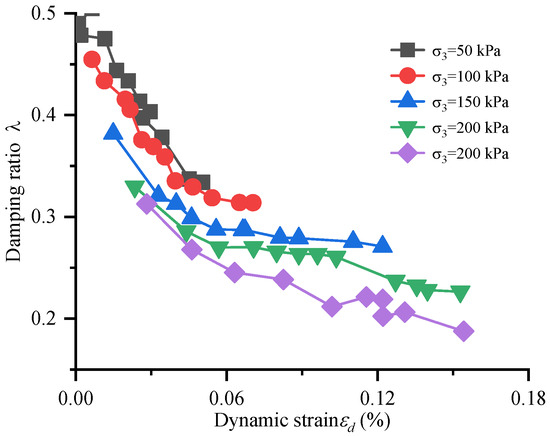 The damping ratio of the sample was calculated from Equation (10). Figure 11 shows the variation law of the damping ratio of the sample. It can be seen from the figure that the damping ratio shows a decreasing variation law with the increase in dynamic strain and confining pressure.