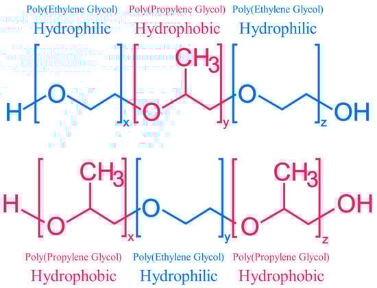 - Alexandridis, P.; Hatton, T.A. Poly(ethylene oxide)–poly(propylene oxide)–poly(ethylene oxide) block copolymer surfactants in aqueous solutions and at interfaces: Thermodynamics, structure, dynamics, and modeling. Colloids Surf. A Physicochem. Eng. Asp. 1995, 96, 1–46. [Google Scholar] [CrossRef]