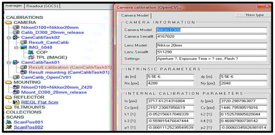 - The captured digital images by Nikon (Tokyo, Japan) D300 digital camera were used in the calibration task of the RiSCAN. Nikon digital camera was mounted on the top of Riegl LMS-Z620 laser scanner (in the laboratory test), as shown in Figure 5.