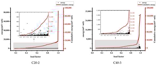 Since the pattern of energy generated during the destruction of different strengths of concrete specimens is similar, the representative specimens, C20-2 and C40-3, were selected for analysis. The loads were normalized and the load ratio–energy scatter plot and load ratio–cumulative energy curve were plotted, as shown in