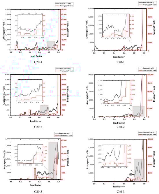 According to the previous analysis, the energy grows larger and the number of events increases when cracks form rapidly. To better judge the signs that occur before concrete damage, the load was normalized, the trends of the mean and peak values of the concrete specimens under the strengths of C20, C40, and C50 were plotted with the increase in the load, and the acoustic emission characteristics were investigated.