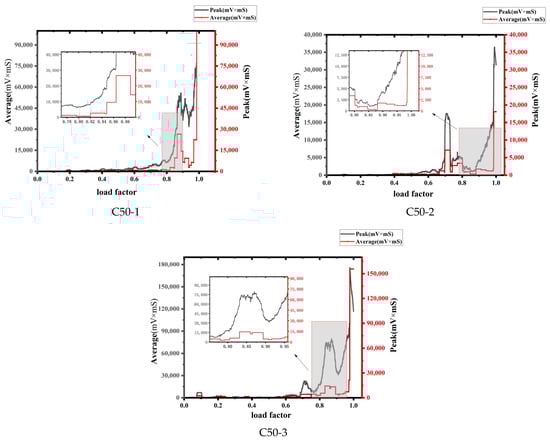 Figure 4 with the increase in the load, the trend in the mean and peak values is approximately the same: At 0–15% of the ultimate load, the different initial states inside each concrete specimen lead to instability in energy release; thus, there will be a larger energy value. The mean and peak values tend to stabilize at 15–55% of the ultimate load; at 55–85% of the ultimate load, the mean and peak values increase steadily, and the cracks inside the specimens develop steadily. Finally, at 85–100% of the ultimate load, the mean and peak values increase rapidly, and the cracks develop rapidly until they deeply penetrate the concrete.