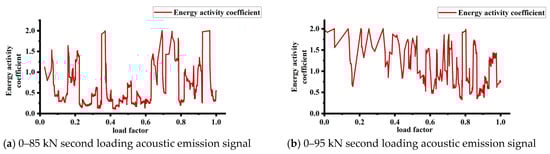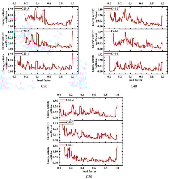 Figure 5, the data after taking the load ratio of 0.1 were studied due to the different initial state of each concrete specimen, which makes the energy release unstable. The trend in the energy activity coefficient of each concrete specimen’s strength was identified as being approximately the same. The energy activity coefficient fluctuates significantly in the early stages and then gradually decreases and tends to stabilize; additionally, apart from some specimens that demonstrate prominent energy activity, the rest of the specimens have stable energy activity coefficients around the load ratio of about 0.6, floating at 0.4.