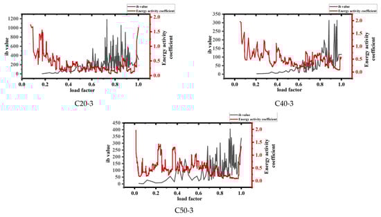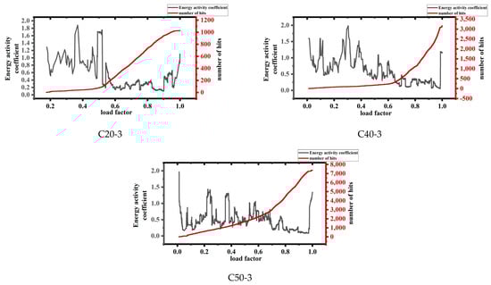 In order to study the acoustic emission characteristics of the congenital defects during the concrete-breaking process and at the stage of new crack development, the load was normalized, and, according to the definition of the energy activity coefficient in the previous section, the trend in the relationship between the load ratio and the energy activity coefficient of the concrete specimens under the strengths of C20, C40, and C50 was plotted with the increase in the load. Finally, the results were analyzed.