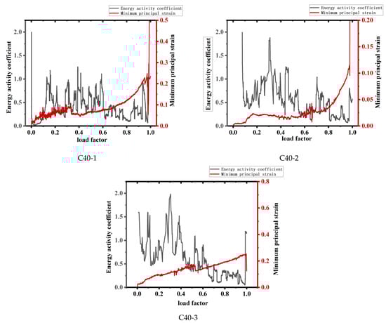 Figure 8, specifically of C40-1 and C40-2, shows that the general trend in the mean value of the minimum principal strain changes from stable slow growth to rapid growth, and the rapid growth stage of the minimum principal strain corresponds to the stage of rapid crack development in the concrete specimens. Furthermore, the growth rate of the mean value of the minimum principal strain becomes faster when the energy activity coefficient decreases and remains stable. Combined with the previous analysis, the smaller the energy activity coefficient, the more intense the crack development. Therefore, we can conclude that when the energy activity coefficient decreases and remains stable, the internal cracks in the concrete continue to develop, the deformation continues to increase, and the specimen enters the stage of rapid crack development.