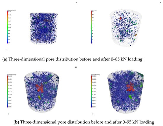 Figure 9, the originally smaller internal pores are reduced substantially after the second compression at 0–80 kN, and the major pores are almost unchanged. Following the second compression at 0–95 kN, the 3D pore map is basically unchanged from the first scanning result.