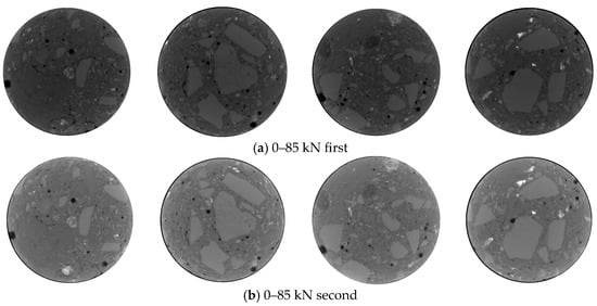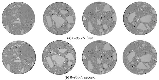 Figure 11, the pore size and number of each slice before and after the two loadings did not change significantly, and the three-dimensional pore map is essentially consistent. The comparison of the obvious cracks in the lower and upper right of the slices at 1/5 and 2/5 shows that the cracks did not change significantly in the second loading. The internal cracks following the first pressurization can be regarded as congenital defects, where these cracks only existed prior to the second pressurization.