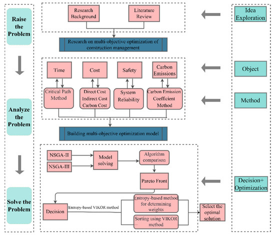 The research methodology roadmap of this paper is illustrated in Figure 1. The article is structured into three sections: problem identification, problem analysis, and problem resolution. Firstly, the theme of “MOP in construction management” is introduced through a literature review of the research background and relevant studies. Secondly, objective models are constructed based on different methodologies for the four identified objectives. Subsequently, the constructed objective models are solved using two algorithms, and the superiority of the resulting solution sets is compared to select the better set of Pareto frontiers. Finally, the entropy–VIKOR method is employed for decision-making.