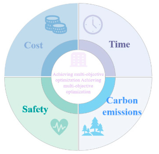 The construction industry, as a critical pillar of our national economy, has played a significant role in driving rapid economic growth. According to the “14th Five-Year Plan”, by 2025, the increasing trends in construction energy consumption and carbon emissions will be effectively controlled, and a development approach that is green, low-carbon, and circular will be essentially established [1]. With the rapid development of the industry, competition among enterprises is intensifying, leading to an increase in the complexity of engineering project management. In engineering management practices, goals such as time, cost, carbon emissions, and safety are crucial to the success of a project. These goals are both conflicting and interrelated, and negligence in any aspect could potentially have adverse effects on the project [2,3,4]. Achieving a balance among multiple objectives is essential to ensuring the success of a project and maximizing corporate interests. Therefore, achieving this balance among these objectives is crucial, as it not only ensures the success of the project but also maximizes corporate benefits.